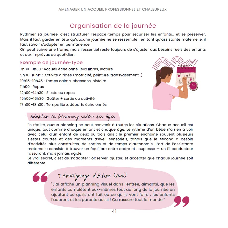 Ce guide de plus de 200 pages a été conçu pour accompagner les assistantes maternelles dans toutes les dimensions du métier : obtention et renouvellement de l’agrément, organisation de l’accueil, contrat, obligations légales, communication avec les familles, développement de l’enfant, hygiène, sécurité, démarches administratives et fin de contrat.