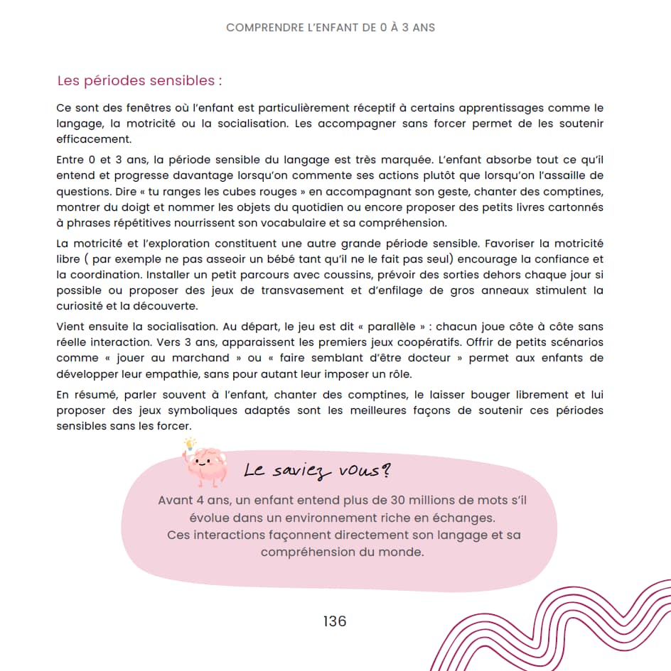 • un chapitre complet sur les besoins de l’enfant de 0 à 3 ans : développement, périodes sensibles, signaux à observer
